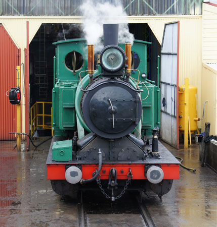 The locomotives in use on the line are some of those which used to work it having, very fortunately, survived on display at various locations. They are 0-4-2t locos with 4 simple cylinders, the outside pair drive the adhesion wheels and the inside pair the pinions which engage the rack. The two sets of engines are not linked an anyway. In the cab the driver has 2 regulator handles to operate. These locomotives were built by Dubs (Nos. 1-4) and North British (No.5) of Glasgow. They were originally coal fired but were converted to burn oil when in service for the Mt Lyell Company. Today they still burn oil but now 'boiler oil' - a spun and filtered used oil - rather than the heavy oil of previous times.