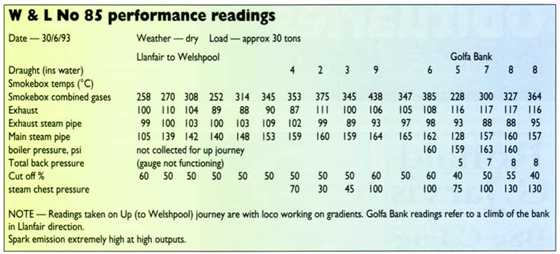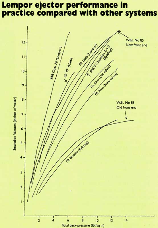 The most efficient, simplest evolutionary designs of modern front end arrangement are the Kylpor, Lempor and Lemprex systems developed by L.D. Porta and his associates. It is these systems that are being used on the W&L. In terms of narrow gauge locomotive performance and improvements, the Ffestiniog led the way in a series of experiments using the ex-Penrhyn Linda. This loco was the testbed for oil-firing in the 1970s and in the mid-1980s was modified again to burn coal on the Gas Producer Combustion System. At the same time the front end was modified to the Lempor system, with a four-nozzle blastpipe top and a tapered chimney replacing the original Hunslet-designed article. The reason for the front end redesign was to produce a reactive exhaust which drew evenly across the firebed and also to produce proportional high levels of turbulence, as primary air intake is limited to very low levels in the Gas Producer system. Combustion of the gases takes place above the firebed, using much higher levels than normal of secondary . While the converted Linda worked reasonably satisfactorily, the reduction in oil prices (the increase in which had led to the Gas Producer experimentation) meant that it was more feasible to return the loco to oil firing. The front end modifications remained and now provide an interesting comparison with the unaltered Blanche in terms of total back pressure against smokebox vacuum, as shown on the graph. |