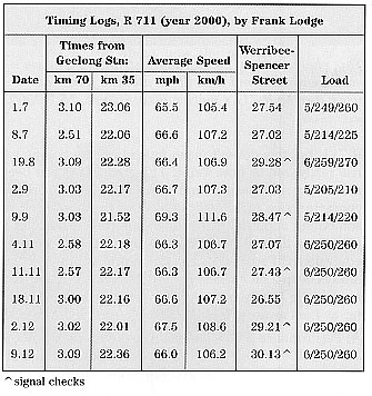 As an extra response to the question of performance, Dave Macartney forwarded the following tables. These timings were all recorded by F G. Lodge on the Warrnambool line aboard what is claimed to be the fastest regular steam hauled train in the world. The figures speak for themselves [see page 26].