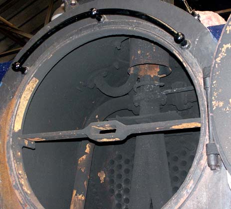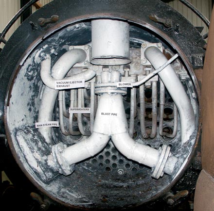 A little while ago Sir Drefaldwyn had her smokebox prepared for display at a Gala weekend. it is conveniently still labeled ! The Nigel Day / Shaun McMahon Lempor type nozzle can clearly be seen on top of the blast pipe. August 14 2003 To view a larger, and thus clearer, version of this photograph (it is 200kb in size) click here. |