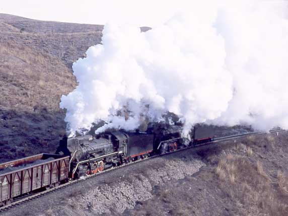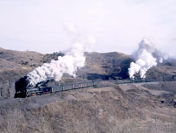 A loaded train climbs towards the first tunnel on the Chengde steelworks branch banked by 2 JS 2-8-2s. February 1999