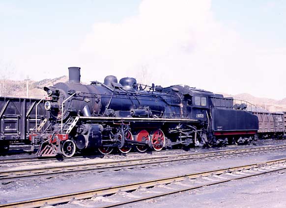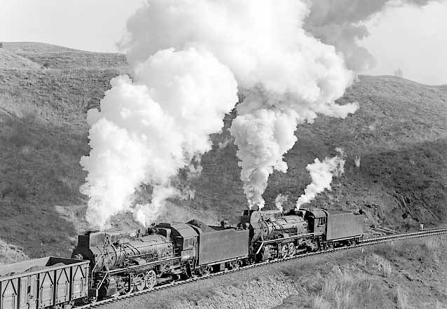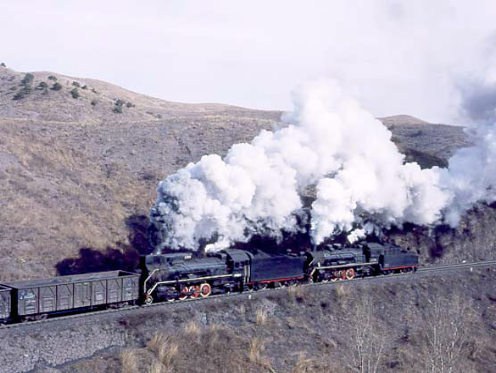 A SY 2-8-2 and a JS 2-8-2 bank a steel works bound train between the first and second tunnel on the Chengde steelworks branch. February 1999.