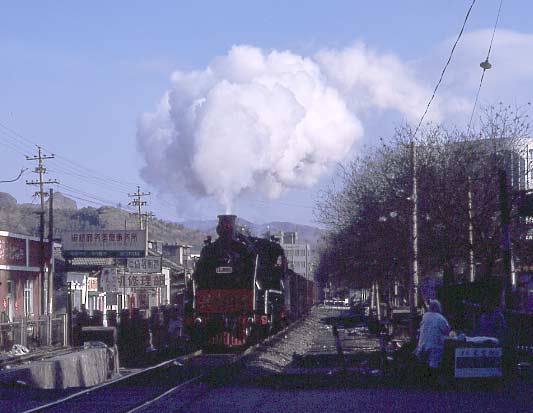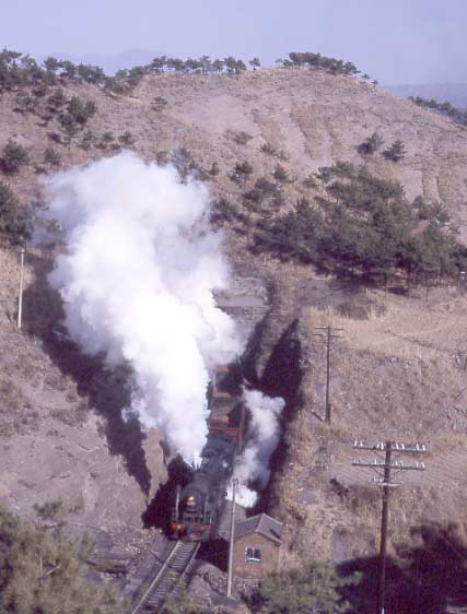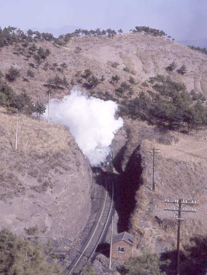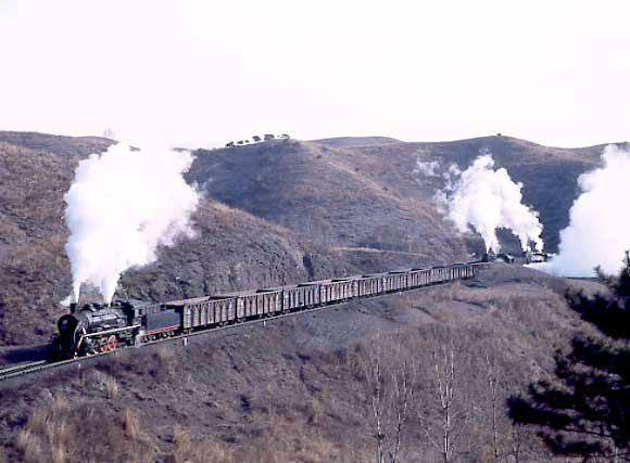 A loaded train climbs towards the first tunnel on the Chengde steelworks branch. It is headed by an SY 2-8-2 and banked by 2 JS 2-8-2s. February 1999