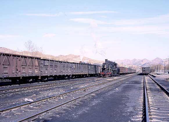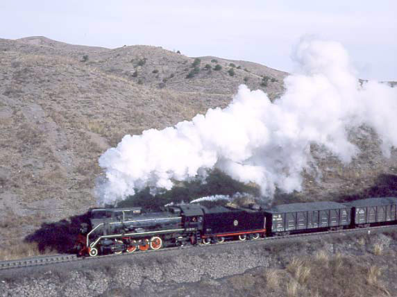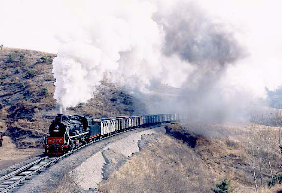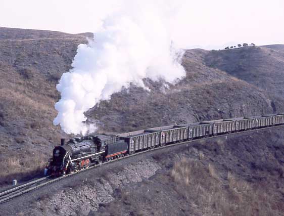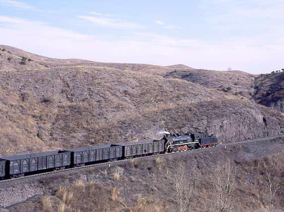 A loaded train climbs towards the first tunnel on the Chengde steelworks branch headed by an SY 2-8-2. February 1999